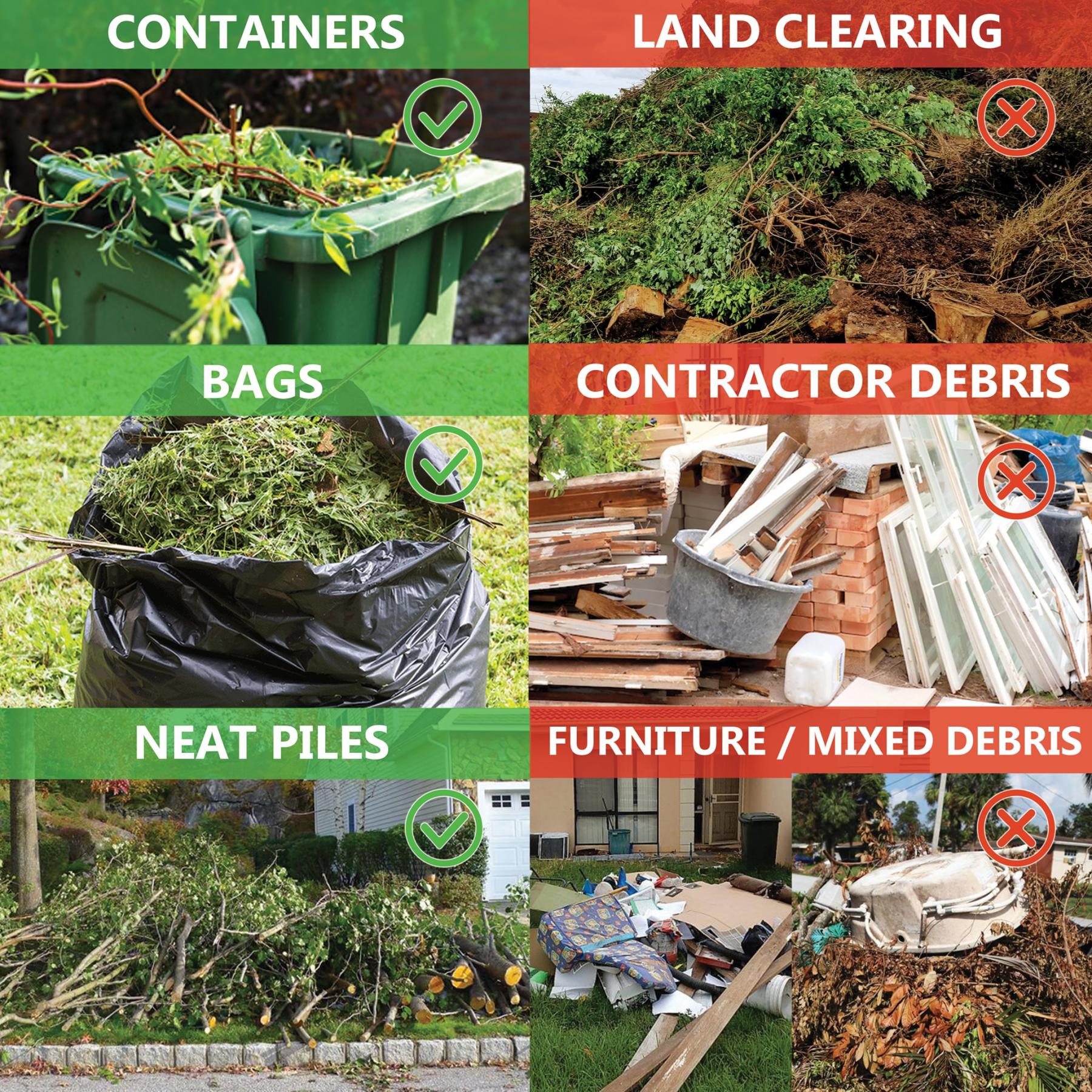 Residents are encouraged to take this opportunity to complete yard work and place debris at the curb for collection. Loose debris such as pine straw and leaves should be bagged and large debris such as limbs should be cut and placed in a pile at the street. This special collection is for residential yard debris ONLY. Contractor debris, mixed debris, and junk items such as old furniture and appliances WILL NOT be collected.