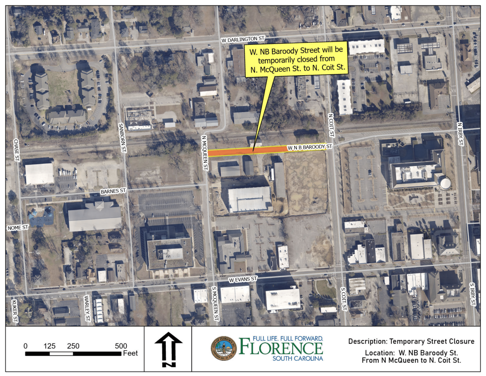 The City of Florence would like to notify the public that W. NB Baroody Street, from N. McQueen Street to N. Coit Street, is closed until further notice to allow for the construction of the apartment complex at the Urban Square Project site, as well as planned streetscape improvements. The street closure is expected to last for six months.