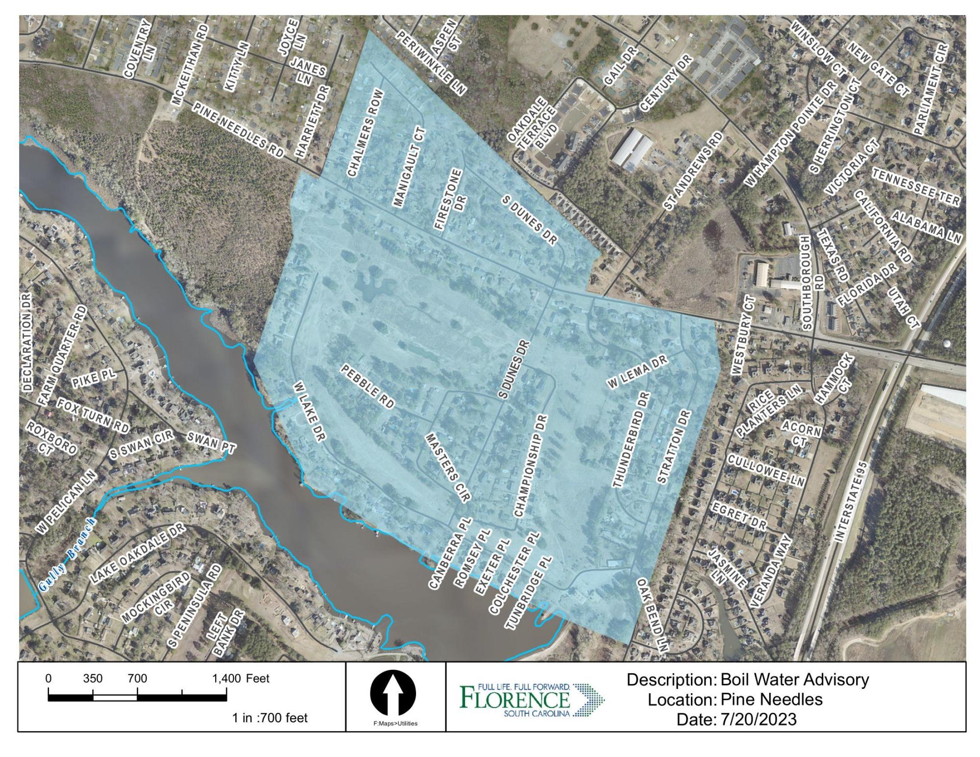 FLORENCE, SC – The City of Florence is issuing a Boil Water Advisory due to a 6” line break at the intersection of Stratton Drive and Thunderbird Drive which resulted in loss of water pressure and disrupted water service for residents located within the 3700 - 3900 Block of Pine Needles Road, Chalmers Drive, Manigault Court, Firestone Drive, Lake Drive, Colchester Place, Exeter Place, Romsey Place, Canberra Place, Dunes Drive, Pebble Road, Masters Court, Championship Drive, Thunderbird Drive, West Lema Drive and the 800 Block of Stratton Drive. The interruption occurred Thursday, July 20th, 2023, and city staff is on site completing necessary repairs to restore water to impacted customers.