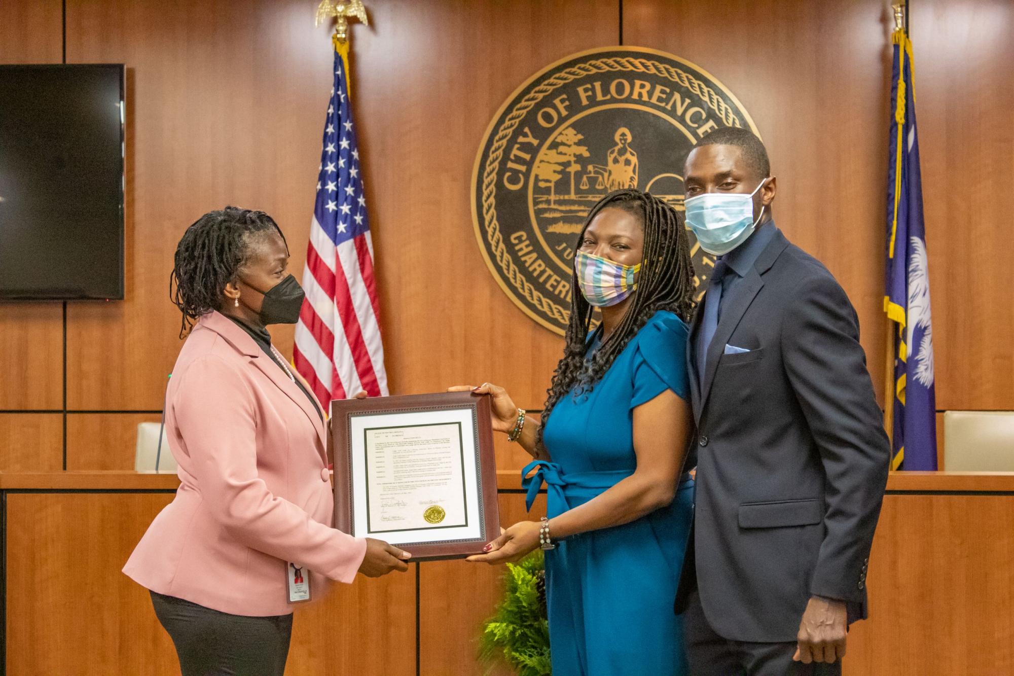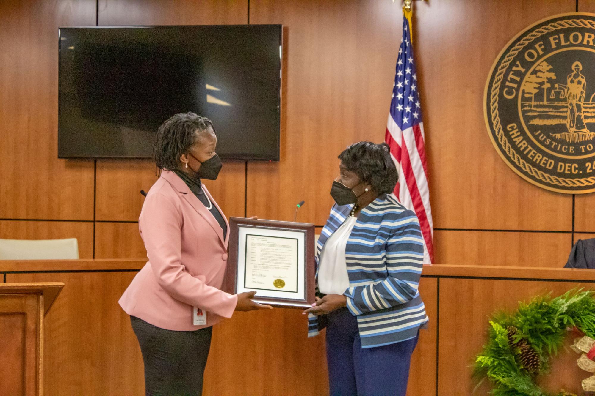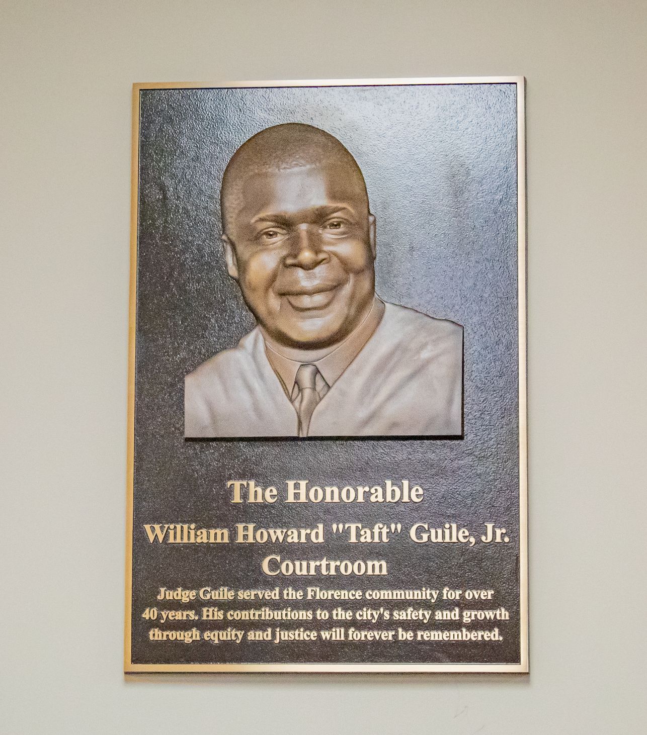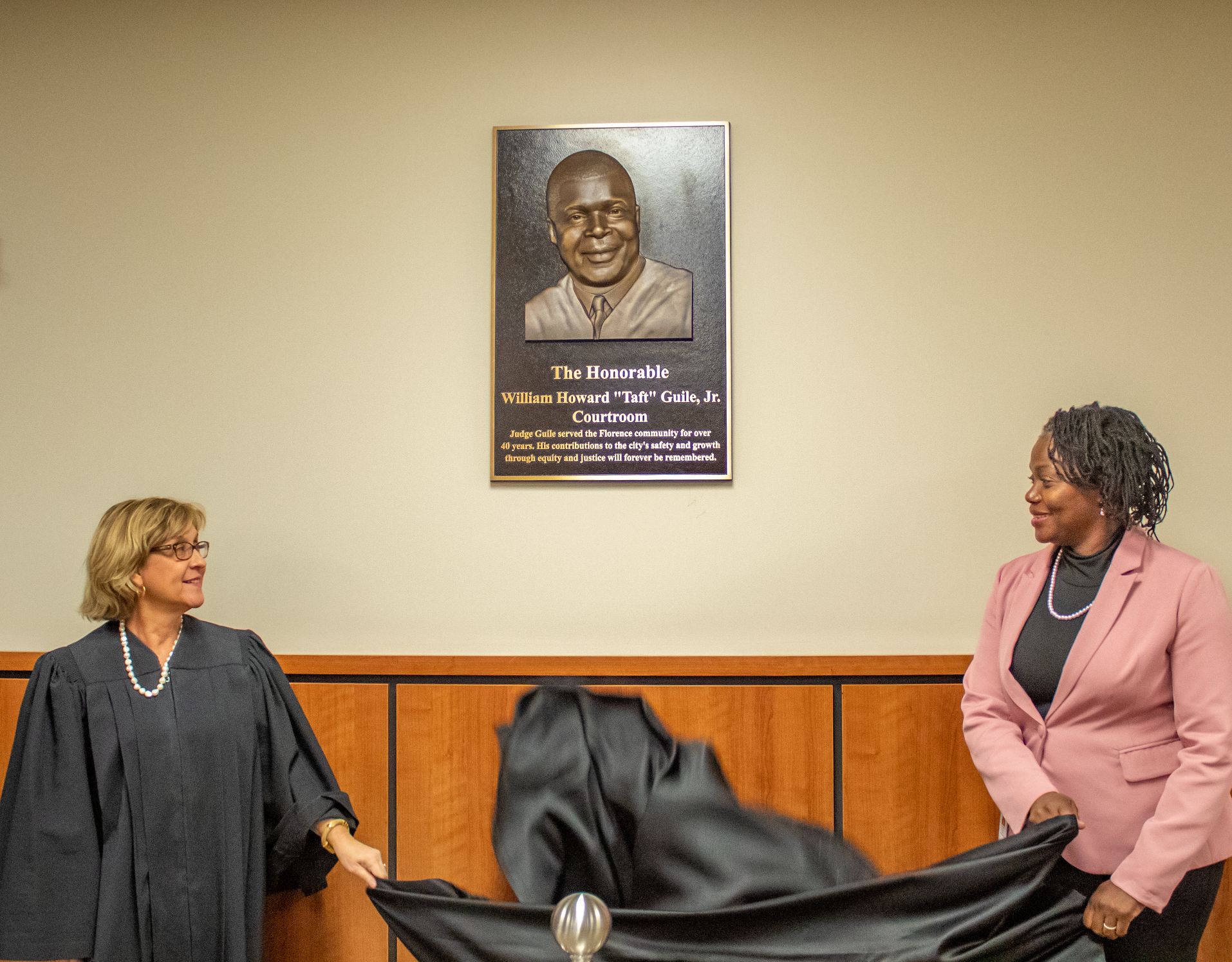 City of Florence Municipal Courtroom Naming Ceremony: Mayor Teresa Myers Ervin and the Honorable Debra O. Jackson unveil a new plaque designating the courtroom as The Honorable William Howard "Taft" Guile, Jr, Municipal Courtroom.