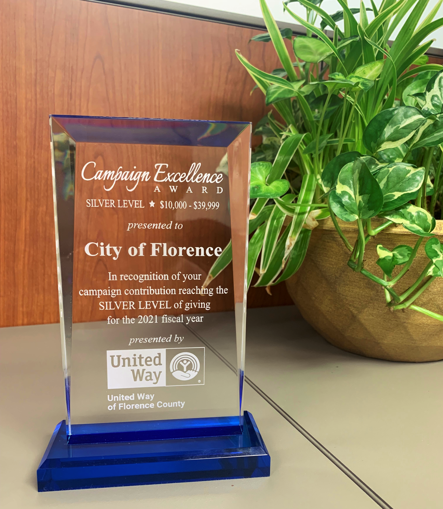 The City of Florence was recently recognized by the United Way of Florence County for its campaign contribution that reached the Silver Level of giving for the 2021 fiscal year.