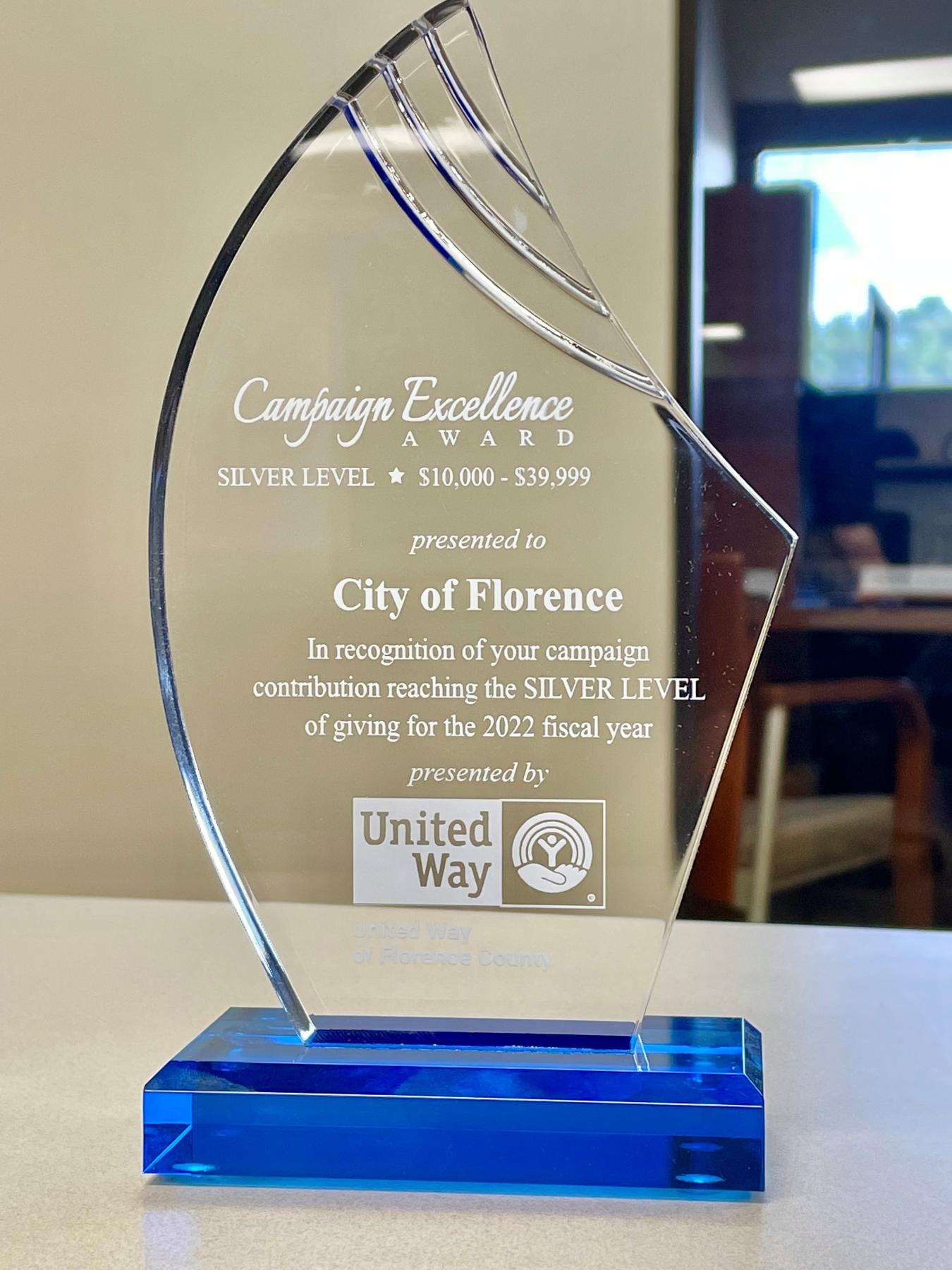 The City of Florence received the award on June 21, 2022 from the United Way of Florence County for its campaign contribution that reached the Silver Level of giving for the 2022 fiscal year.