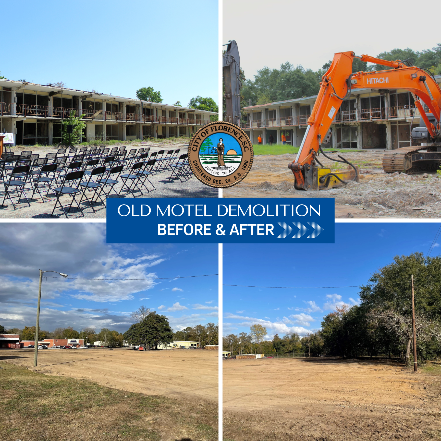 The City of Florence worked closely with three great partners to make the removal of the blighted property a reality. These entities acknowledge the importance of the E. Palmetto Street gateway and recognize that redevelopment and beautification efforts at this location will create a better, safer, and more appealing entrance to Florence for travelers coming from Florence Regional Airport, Francis Marion University and Myrtle Beach and for newcomers or new businesses desiring to relocate to the area.