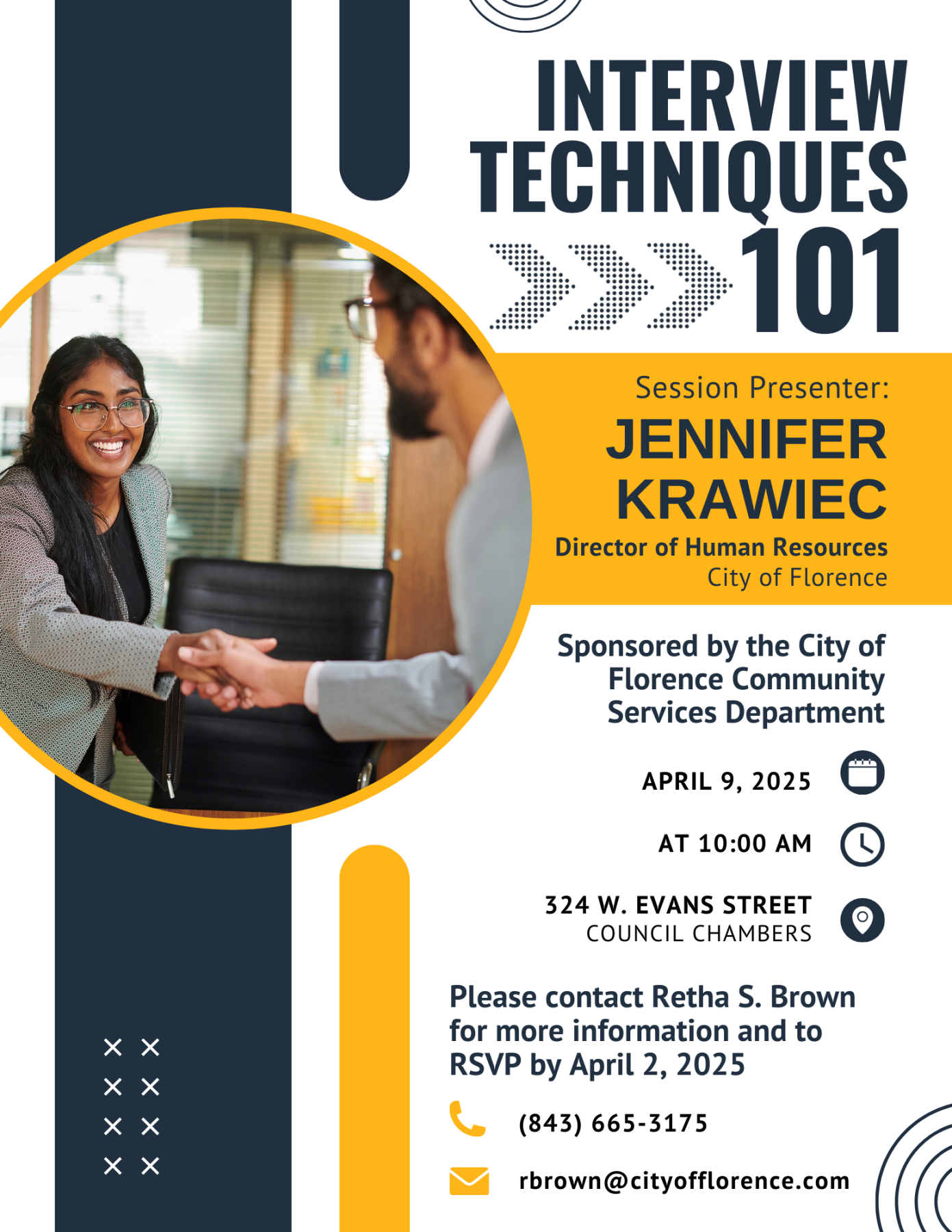 FLORENCE, SC – The City of Florence Community Services Department is excited to host Interview Techniques 101, a valuable workshop designed to help job seekers enhance their interview skills. The session will be led by Jennifer Krawiec, Director of Human Resources for the City of Florence, and will take place on April 9, 2025, at 10:00 AM in Council Chambers located on the first floor of the City Center at 324 W. Evans Street.