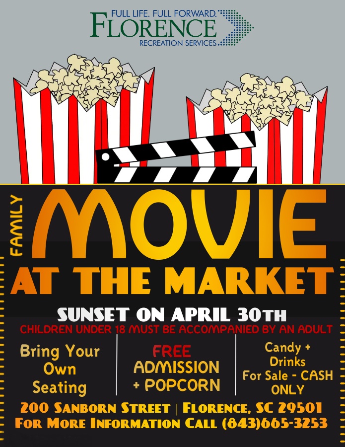 Movie At The Market, coming soon! At the City Center Farmers Market! The City of Florence Recreation Department will be hosting a Movie At The Market on April 30th. Admission and popcorn will be FREE, candy and drinks will be available for purchase.