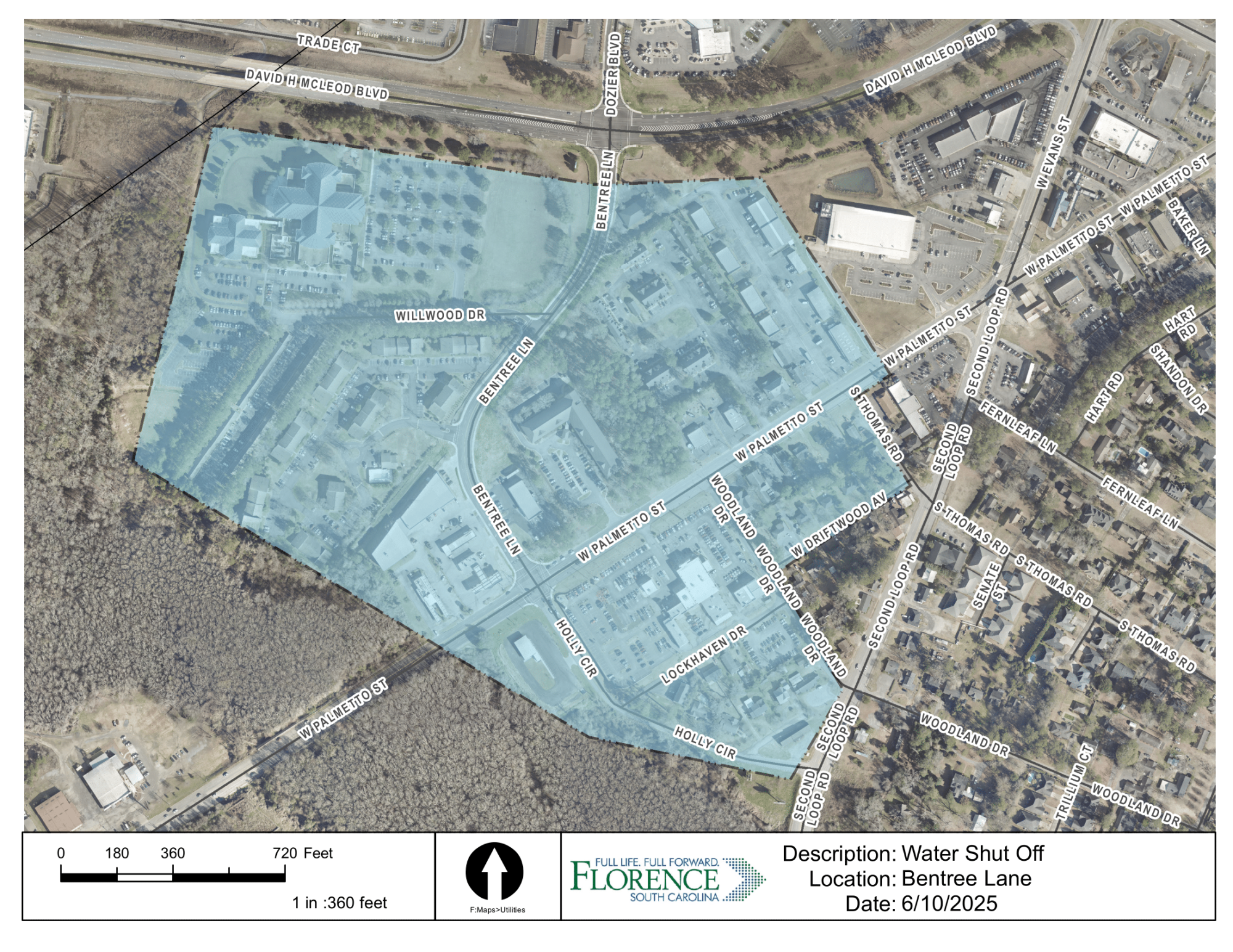 FLORENCE, SC – The City of Florence will temporarily interrupt water service on Tuesday, June 10, 2025, from 9:00 p.m. to 3:00 a.m. for customers on Bentree Lane, Wildwood Drive, Holly Circle, Lockhaven Drive, Woodland Drive, and the 2200-2400 blocks of West Palmetto Street. This planned disruption is necessary to connect a new water main along Holly Circle as part of improvements related to the South Carolina Department of Transportation’s (SCDOT) road-widening project.