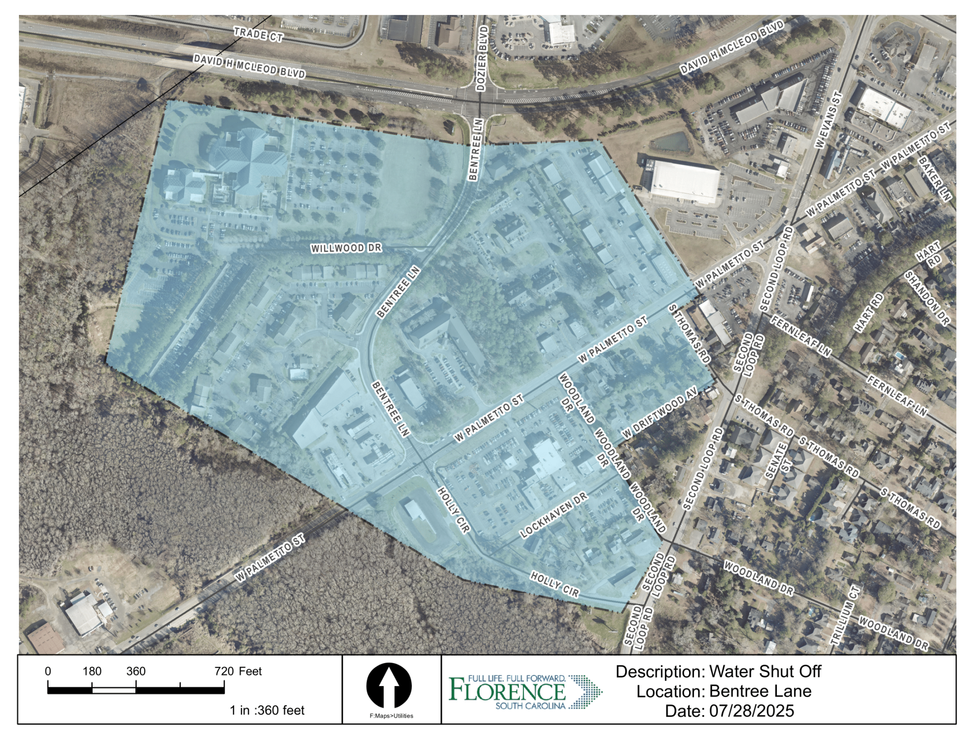 FLORENCE, SC –   The City of Florence will temporarily interrupt water service on Monday, July 28, 2025, from 9:00 p.m. to 3:00 a.m. for customers on Bentree Lane, Willwood Drive, Holly Circle, Lockhaven Drive, Woodland Drive, and the 2200-2400 blocks of West Palmetto Street.  This planned disruption is necessary to connect a new water main along Holly Circle as part of improvements related to the South Carolina Department of Transportation’s (SCDOT) road-widening project.