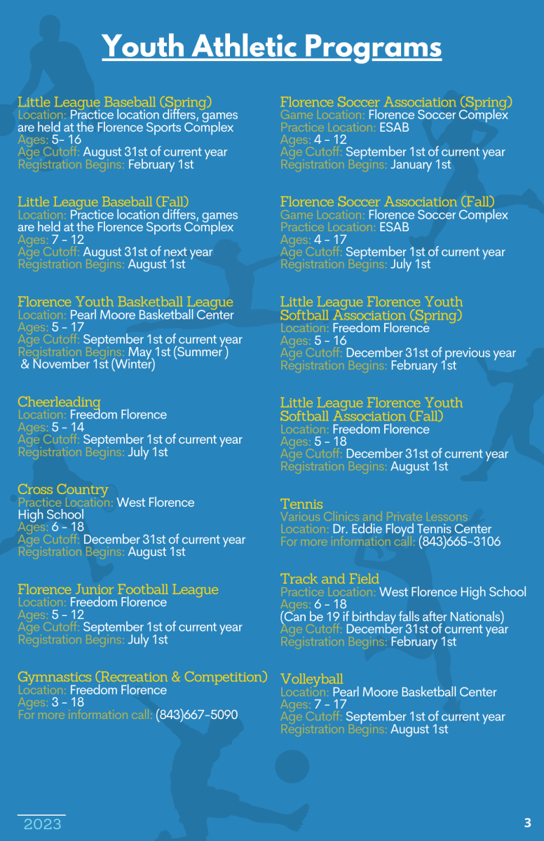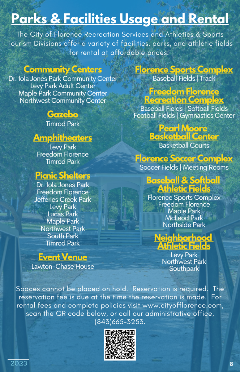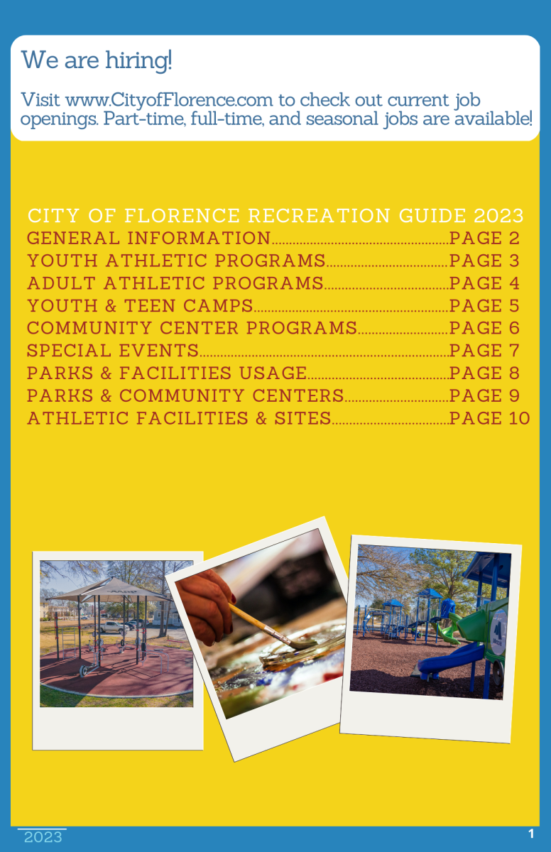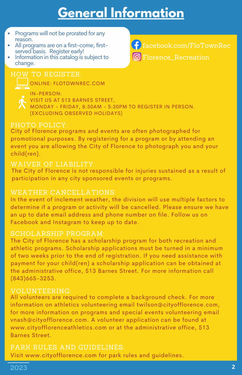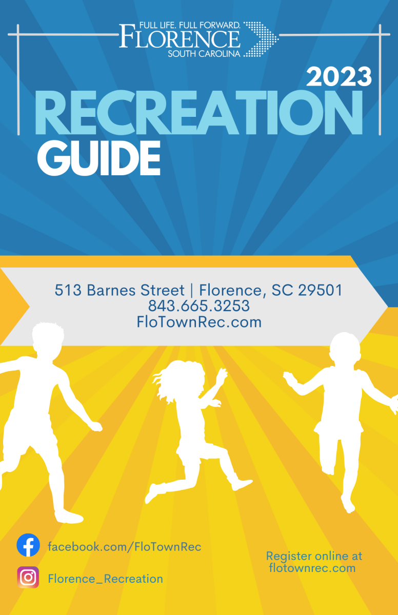 Visit the link below to see what the City of Florence has to offer in 2025. If you have any questions our Parks, Recreation & Sports Tourism staff can be reached at (843) 665-3253, Monday through Friday, 8:30 AM to 5:30 PM. City of Florence Recreation Program Guide