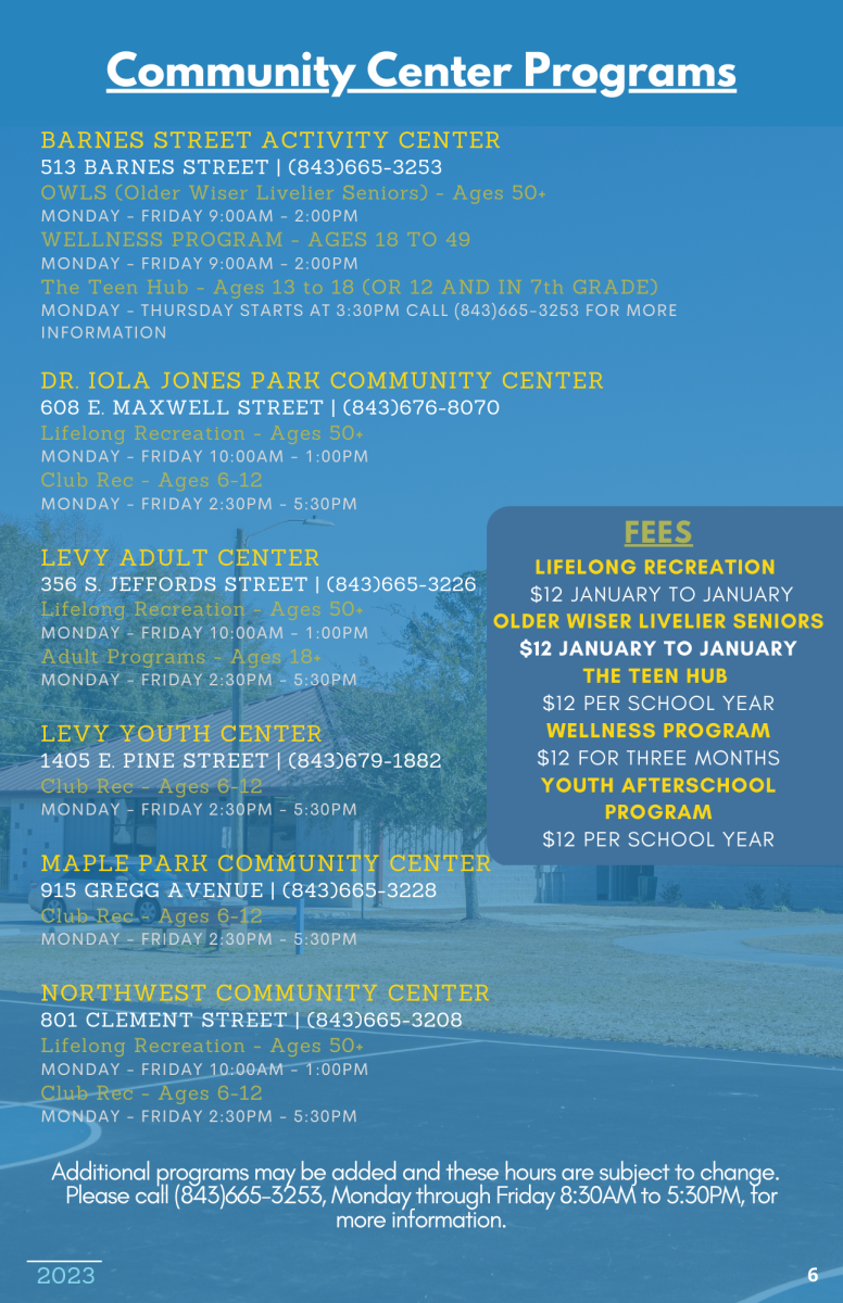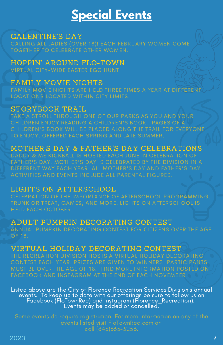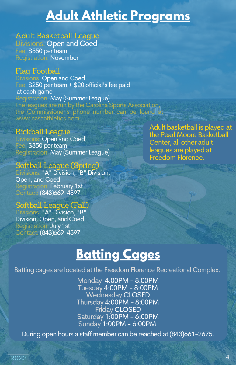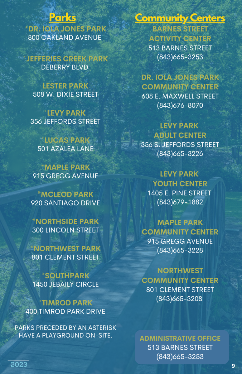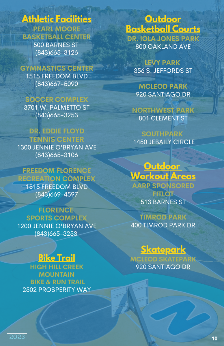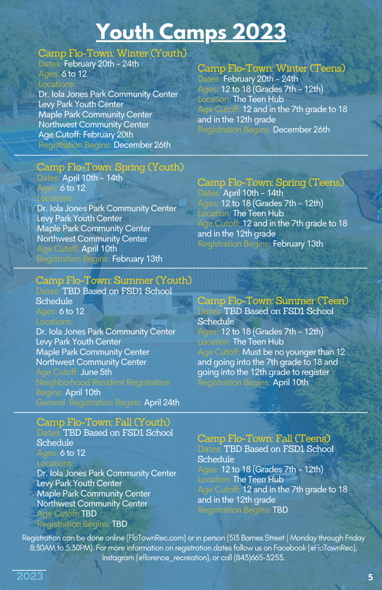 Visit the link below to see what the City of Florence has to offer in 2025. If you have any questions our Parks, Recreation & Sports Tourism staff can be reached at (843) 665-3253, Monday through Friday, 8:30 AM to 5:30 PM. City of Florence Recreation Program Guide